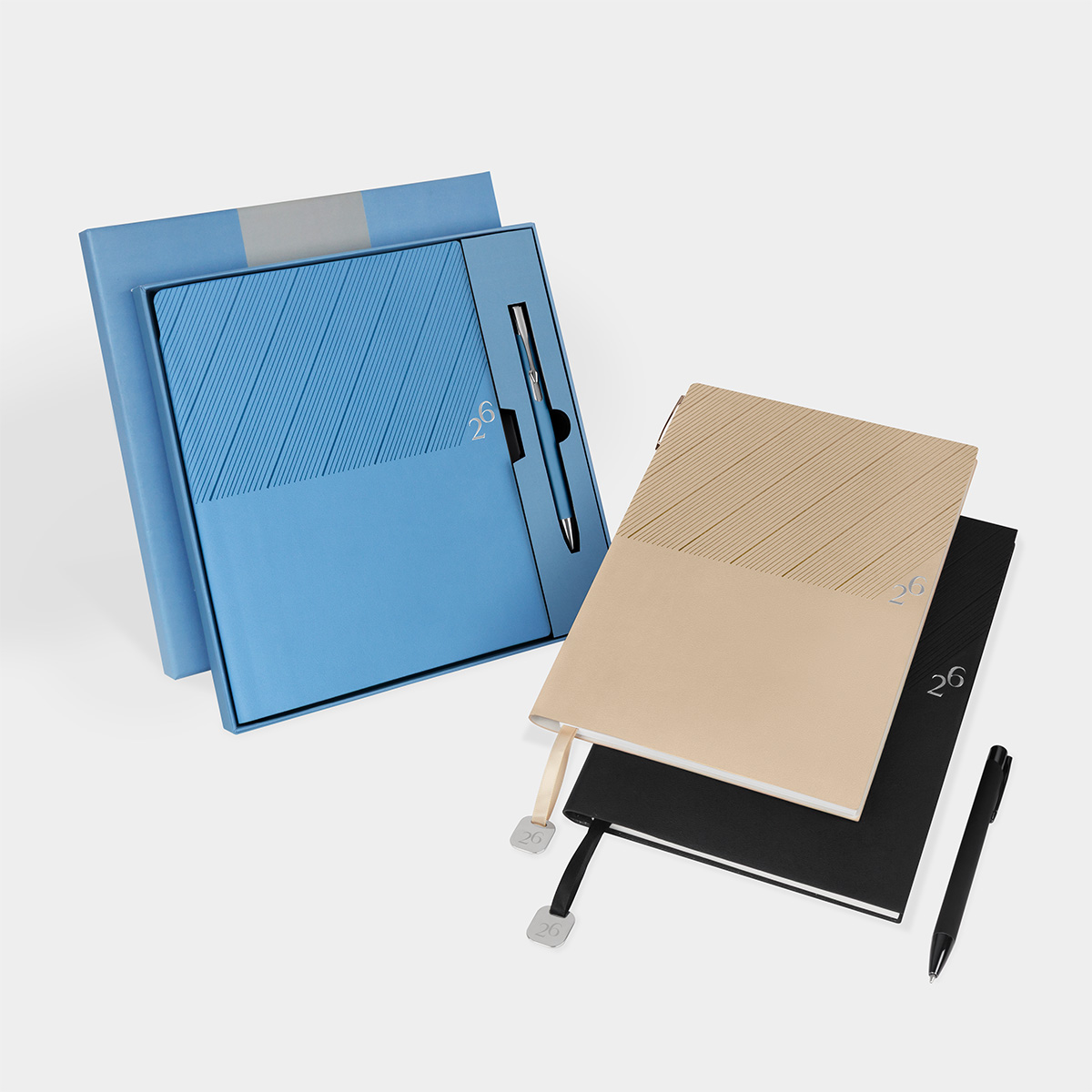 Incluye datos personales, calendarios de 2025 a 2027, un completo planeador para 2026, presupuesto de gastos, seguimiento de nuevos hábitos, organizador de tareas, planeador de proyectos e incluso los días festivos. La Agenda Semanal Clásica 2026 viene presentada en una elegante caja individual del mismo color, con un práctico separador con placa metálica y un bolígrafo para que empieces a usarla al instante. ¡Organización y estilo en un solo producto promocional! Perfecta como regalo corporativo o personal.