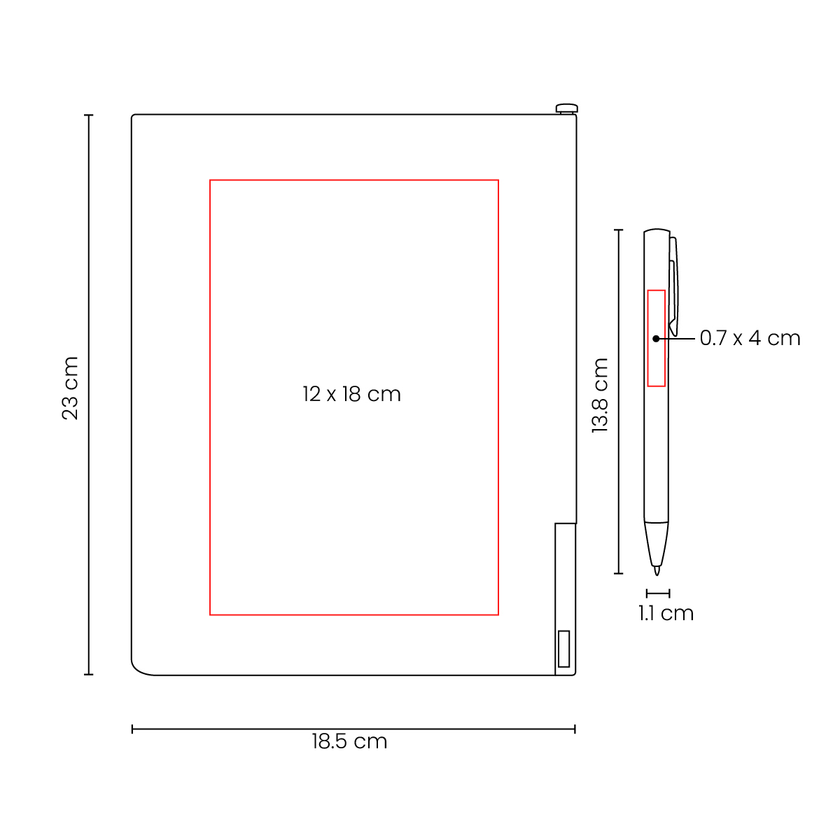 | Área de Impresión | 12 X 18 Cm Agenda / 0.7 X 4 Cm Bolígrafo |