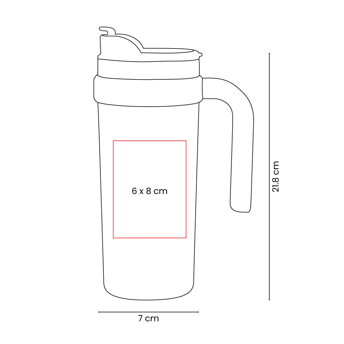 Doble pared. Cerrado al vacío. Pared interna y externa de acero inoxidable. Tapa de plástico con cierre de rosca y sobretapa de push. Asa de plástico. Mantiene temperatura caliente 6 hrs y fria 12 hrs. Incluye caja individual.
