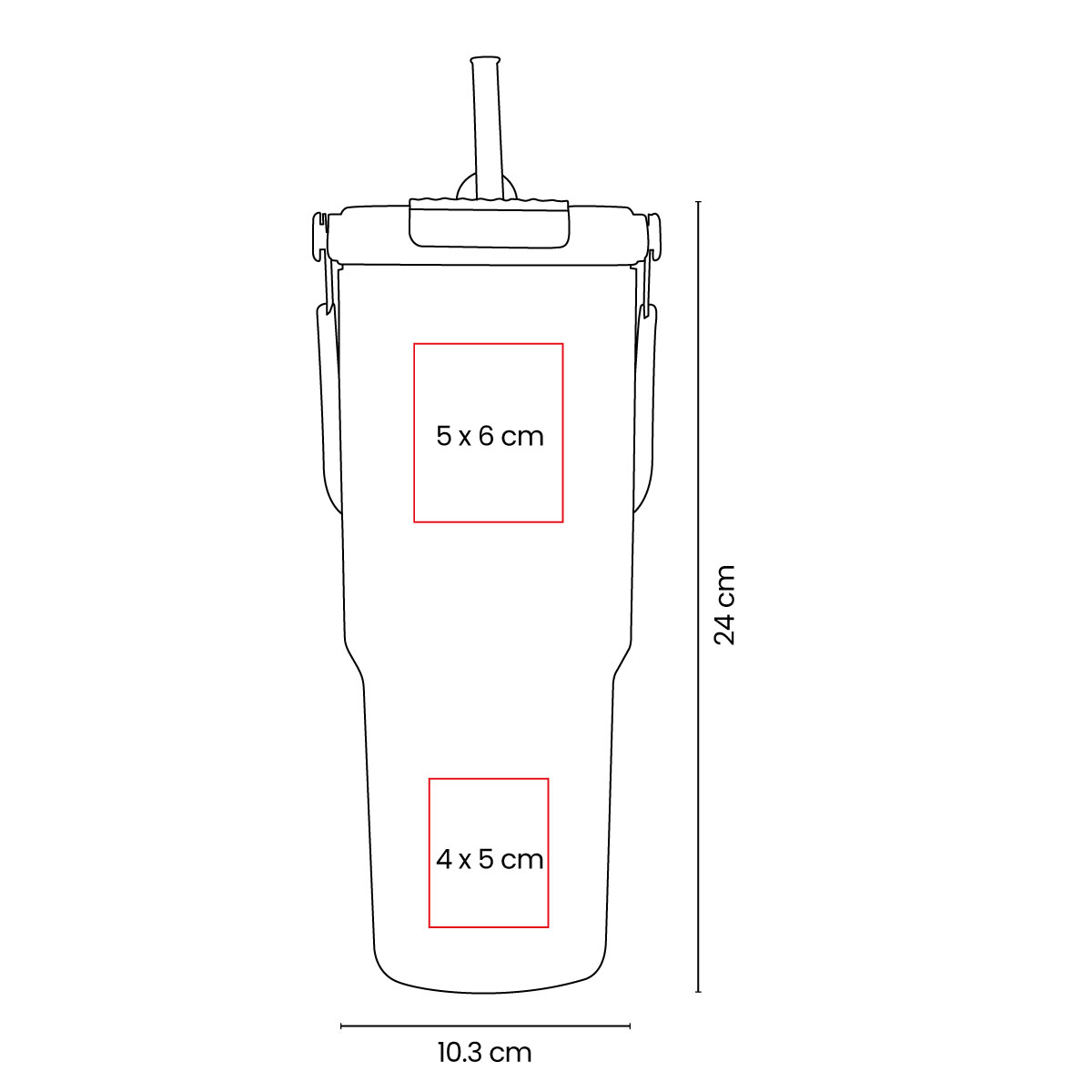 Incluye un práctico popote metálico con mecanismo automático y base de silicona que lo eleva al abrirse. Su asa plegable facilita su transporte, permitiéndote llevarlo cómodamente a donde quieras. Con una capacidad de 28 Oz (aproximadamente 830 ml) y una base estable de 7 cm, el Termo Graben es la solución ideal para hidratarte con estilo. Viene en caja individual lista para regalar o incluir en tus promociones.