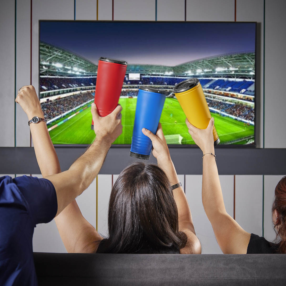 ¡Lleva la emoción de los eventos deportivos al siguiente nivel! Termo equipado con una boquilla especial en la tapa que realiza una doble función; como trompeta, para animar tu evento favorito y al mismo tiempo, disfrutar de tu bebida preferida. Termo doble pared. Pared interna de plástico y externa de acero inoxidable. Tapa de plástico con sistema push y válvula de seguridad. Capacidad de 24 Oz. Base de 7 cm de diámetro. Incluye caja individual.