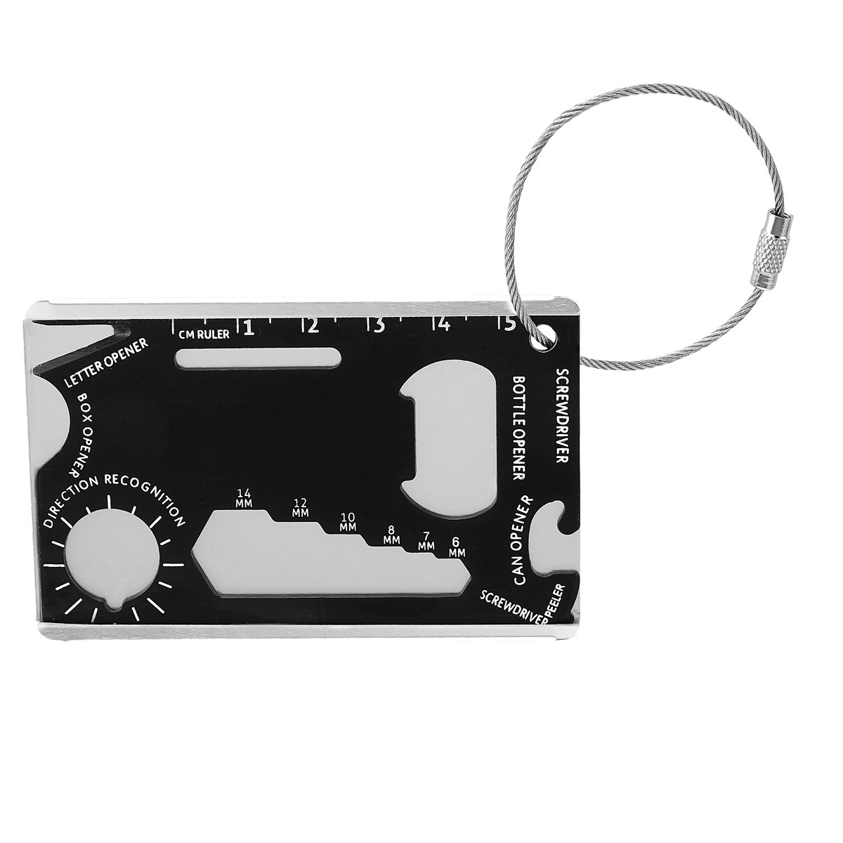 Tarjeta multiherramientas con función de desarmador, abrecartas, abrelatas, destapador, llave inglesa, regla y pelador. Incluye aro para llavero.
