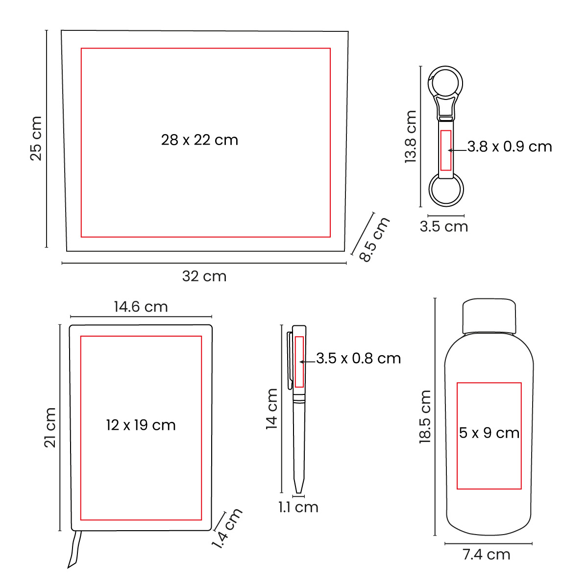 | Área de Impresión | 28 X 22 Cm Caja / 12 X 19 Cm Libreta / 3.5 X 0.8 Cm Bolígrafo / 3.8 X 0.9 Cm Llavero / 5 X 9 Cm Termo |