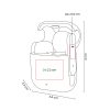 Audífonos bluetooth inalámbricos con base recargable. Control touch para reproducción de música y función de llamada. Reproducción de música de 3 horas aproximadamente. Rango de conexión de 10 metros. Batería de 20 mAh (audífonos) y 180 mAh (estuche). Incluye cable con puerto tipo C.