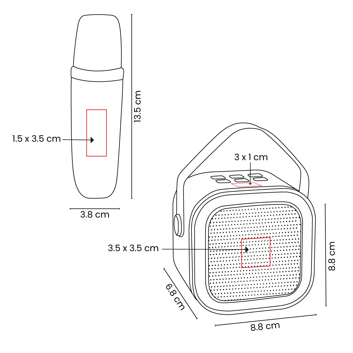 | Área de Impresión | 3 X 1 Cm Arriba / 3.5 X 3.5 Cm Rejilla / 1.5 X 3.5 Cm Micrófono |