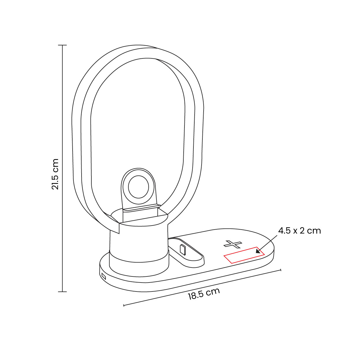 Cargador con Lámpara Valoa – El artículo promocional perfecto para tu escritorio o mesita de noche. ¿Buscas un cargador que lo haga todo? Valoa combina la funcionalidad de cuatro dispositivos en uno elegante y compacto. Carga de forma inalámbrica tu smartphone, reloj inteligente y auriculares (earbuds) simultáneamente. Además, su lámpara de noche con luz cálida crea un ambiente relajante ideal para descansar o trabajar.