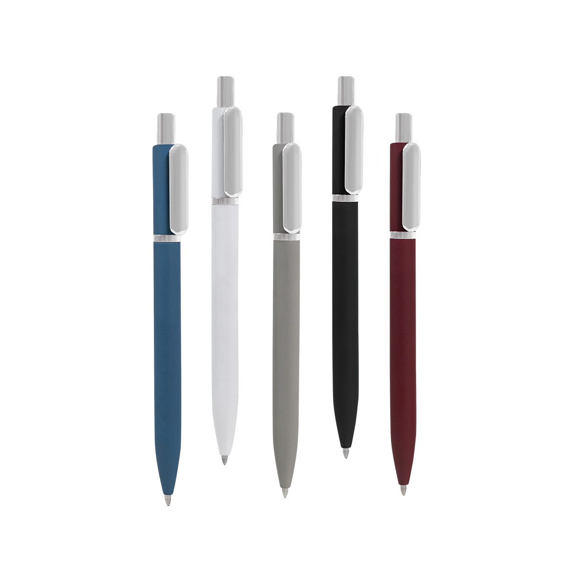 Bolígrafo con terminado rubber y clip metalizado. Mecanismo pulsador.