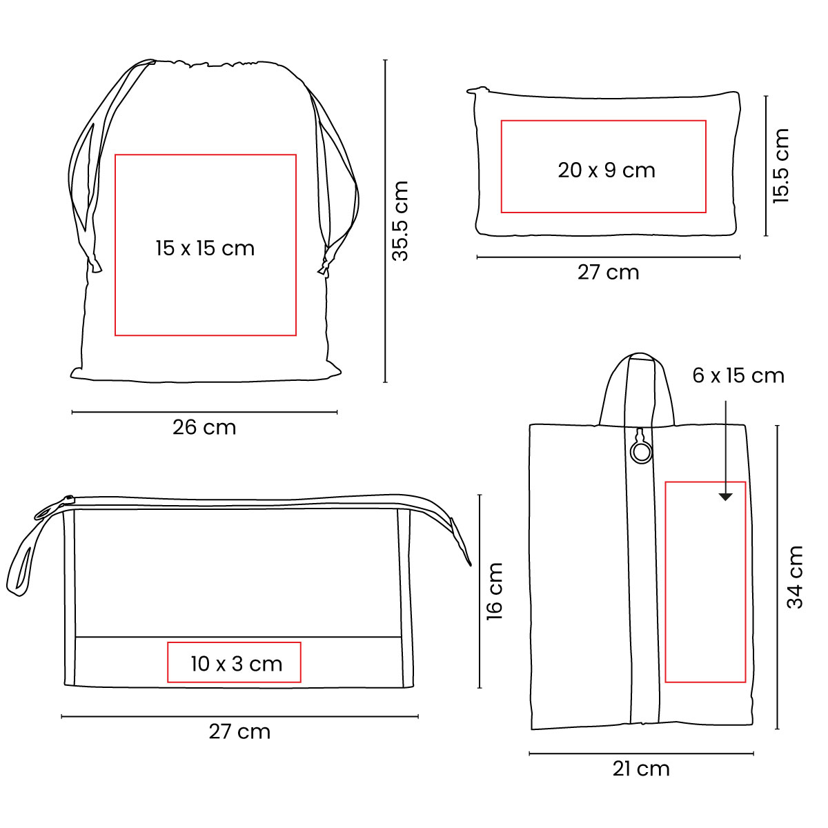 | Área de Impresión | 20×5 Cm Cm Bolsa Grande / 20×4 Cm Bolsa Mediana / 20×3 Cm Bolsa Chica / 15×13 Cm Bolsa para Ropa Interior / 6×15 Cm Bolsa para Calzado / 15×15 Cm Bolsa-morral / 20×9 Cm Bolsa con Cierre / 10×3 Cm Bolsa Cosmetiquera |