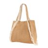 Bolsa con fuelle. Asas de algodón y yute. Compartimento principal con velcro. Flecos de algodón. Para evitar daño en los flecos, la bolsa se entrega semicosida. Es necesario retirar las costuras en cada lado para lograr el efecto despeinado.