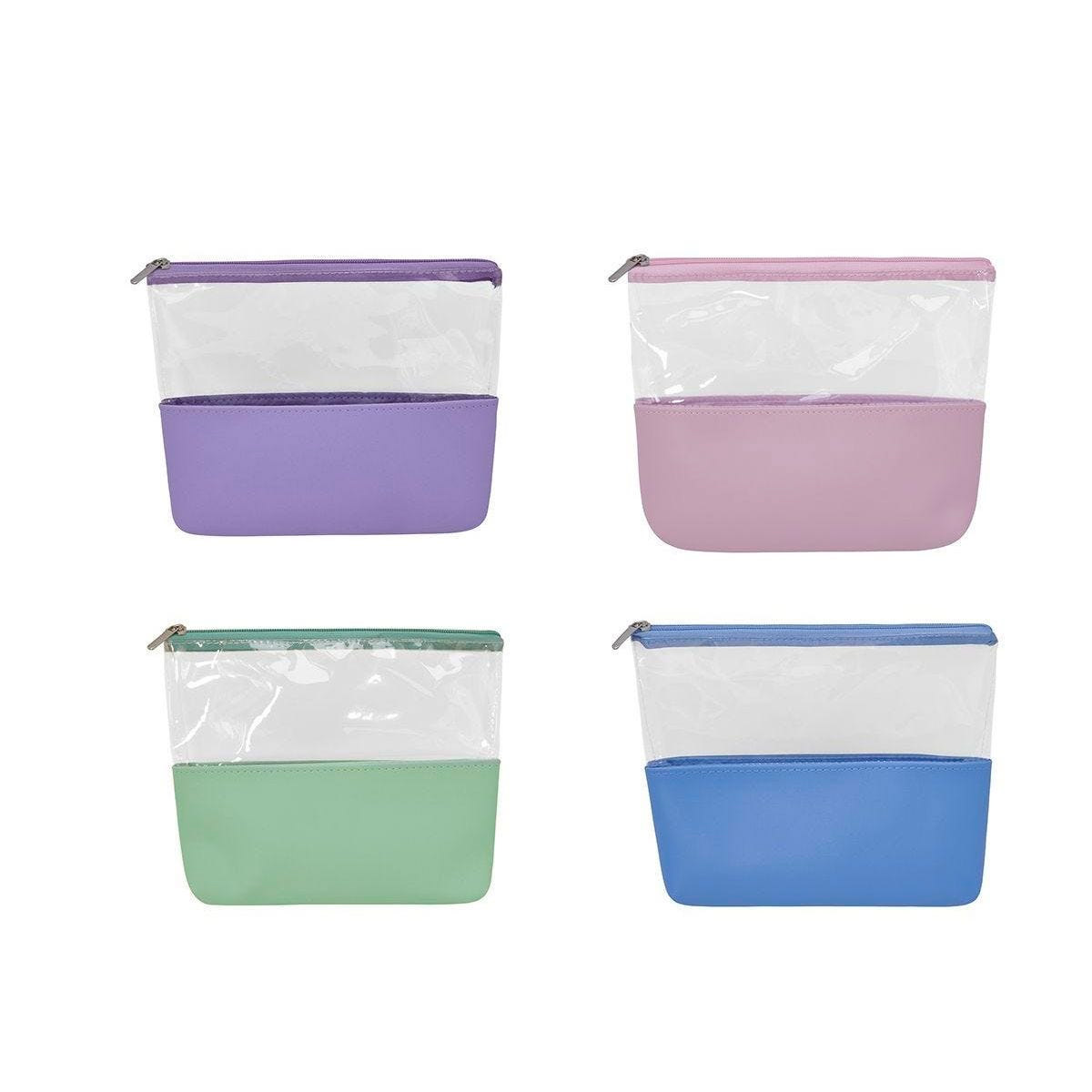 Cosmetiquera con cierre. Diseño combinado de PVC transparente y curpiel de color en base.