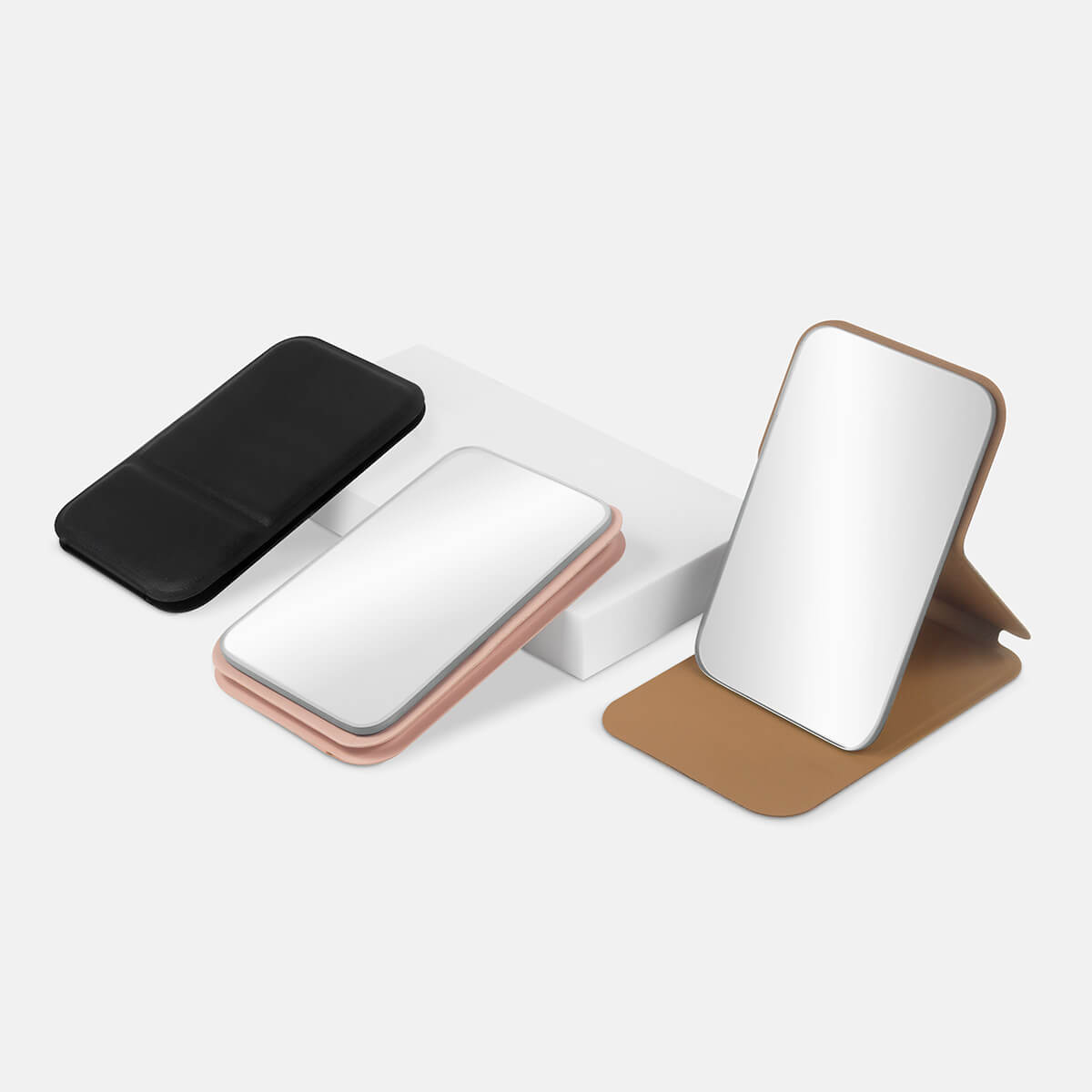 Espejo plegable con cubierta de curpiel. Cuenta con 3 posiciones de inclinación para ajustarlo a tu comodidad. Llevalo en tu bolsa o acomodalo en el tocador.