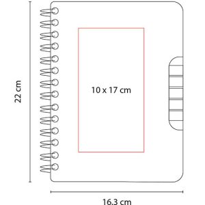 Libreta con 70 hojas de raya. Incluye bolígrafo ecológico y espiral metálico doble.